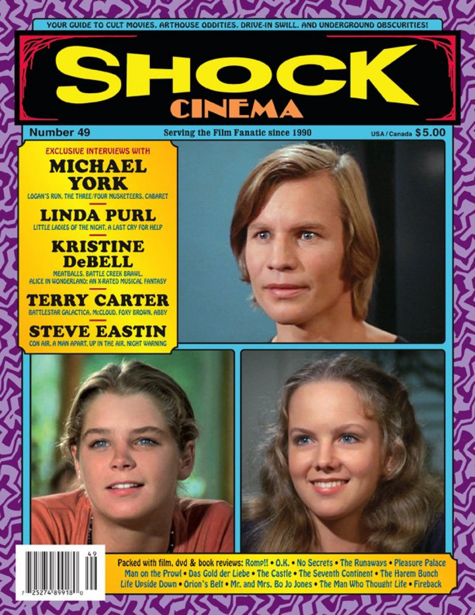 Interviews with Michael York, Linda Purl, Kristine DeBell, Terry Carter, and Steve Eastin. Reviews include Belinda Balaski in the ABC Afterchool Special The Runaways; Michael Verhoeven's O.K.; Monica Gayle in The Harem Bunch, or War and Piece; Rod Taylor in The Man Who Had Power Over Women; Oliver Reed and Peter Cushing in No Secrets; Ryan O'Neal hosts the groovy TV-special Romp!!; Jens Ravn's The Man Who Thought Life [Manden der Tækte Ting]; Jennifer Beals in Sam Fuller's Tinikling or "The Madonna and the Dragon"; Desi Arnaz, Jr. in Mr. and Mrs. Bo Jo Jones; Charles Denner in Alain Jessua's Life Upside Down; Russ Thacker and Brad Sullivan in Parades [a.k.a. The Line]; Hanna-Barbera's Dusan Vukotic's The Seventh Continent; Ed Hunt's Canucksploitation duo Pleasure Palace and Diary of a Sinner; Richard Harrison in Fireback and Blood Debts; Alice in Wonderland, Or What's a Nice Kid Like You Doing in a Place Like This?; James Best in Man on the Prowl; Topo Gigio and the Missile War; Alexandra Curtis in Eckhart Schmidt's Das Gold der Liebe; Gian Maria Volonte and Tomas Milian in Face To Face; Brett Piper's Queen Crab; Anurag Kashyap's Gangs of Wasseypur; Gary Graver's And When She Was Bad... [a.k.a. There Was a Little Girl]; Blood Riders: The Devil Rides With Us; Valeria Golino in Little Flames; Manos: The Hands of Fate; et cetera