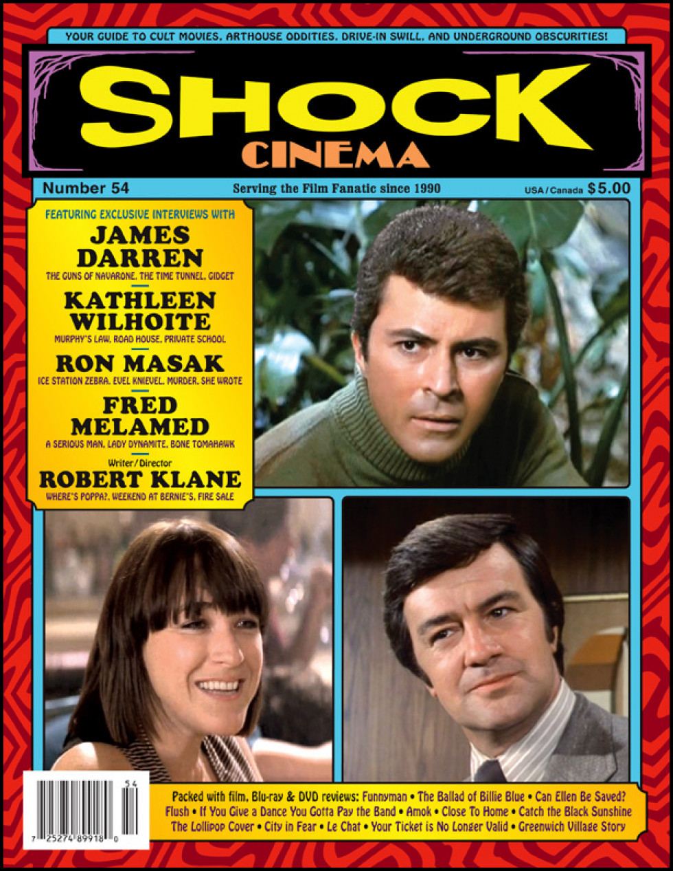 SHOCK CINEMA 54. Interviews with James Darren, Kathleen Wilhoite, Ron Masak, Fred Melamed, and writer/director Robert Klane. Reviews include Peter Bonerz in John Korty's Funnyman; Jason Ledger in The Ballad of Billie Blue; Laurence Fishburne and Albert Hall in If You Give a Dance You Gotta Pay the Band; Richard Harris in Your Ticket is No Longer Valid; Jillian Fargey in the Canadian teen runaway drama Close To Home; Jean Gabin and Simone Signoret in Le Chat; Don Gordon in The Lollipop Cover; Juraj Kukura in Peter Zadek's The Roaring Fifties [Die Wilden Fünfziger]; Barry Brown and Britt Ekland in The Ultimate Thrill; Chris Robinson and Ted Cassidy in Catch the Black Sunshine; Bob Hope in Joys!; Robert Hogan and Melinda Plank in Greenwich Village Story; Jean Yonnel in Fyodor Otsep's Amok; Victor Spinetti and Vanessa Howard in Derek Ford's This - That and the Other!; Tom Ligon and Logan Ramsey in Jump [a.k.a. Fury on Wheels]; David Janssen and Mickey Rourke in City in Fear; William Calloway and Jeannie Linero in Flush; Michael Parks in Can Ellen Be Saved?; Tim Noah in In Search of the Wow Wow Wibble Woggle Wazzie Woodle Woo; Derek Ford's Secret Rites; Susan Player in Sergio Martino's Loving Cousins [Cugini Carnali]; Lino Ventura in Pierre Granier-Deferre's The Cage; Cüneyt Arkin in The Sword and the Claw; Michael St, Gerard in Star Time; et cetera.