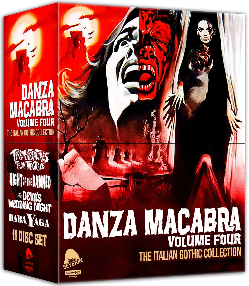 Italian Gothic takes some very unexpected turns down cobwebbed corridors with this all-new quartet of classics, now restored in UHD for the first time ever: Queen of Italian Horror Barbara Steele stars in Massimo Pupillo’s grisly TERROR-CREATURES FROM THE GRAVE, presented in both its U.S. and Italian versions on 3 discs. Director Filippo Walter Ratti melds classic gothic tropes with explicit ‘70s sexuality in NIGHT OF THE DAMNED. Mark Damon and Rosalba Neri consummate the ultimate Satanic mayhem in THE DEVIL’S WEDDING NIGHT from director Luigi Batzella and cinematographer/2nd unit director Joe D’Amato. And Hollywood legend Carroll Baker stars in Corrado Farina’s pop art erotic shocker BABA YAGA, a 4-disc set that includes the first-ever release of a Piero Umiliani soundtrack compilation. All four films have been scanned in 4K from their original camera negatives with more than 12 hours of new and archival Special Features curated exclusively for this collection.