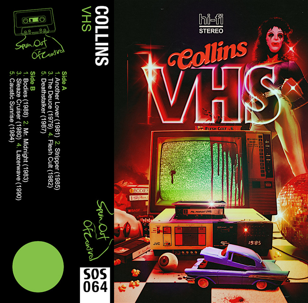 With specially commissioned cover and j-card art by Eric Adrian Lee, ‘VHS’ by Collins is available on two different limited edition hand-numbered colour cassette shells to match the artwork. Choose from a sleazy ‘Scalp Ripper Red’ translucent shell or go for the ‘Neon Green TV Glow’ shell. Catalogue number SOS 064.
