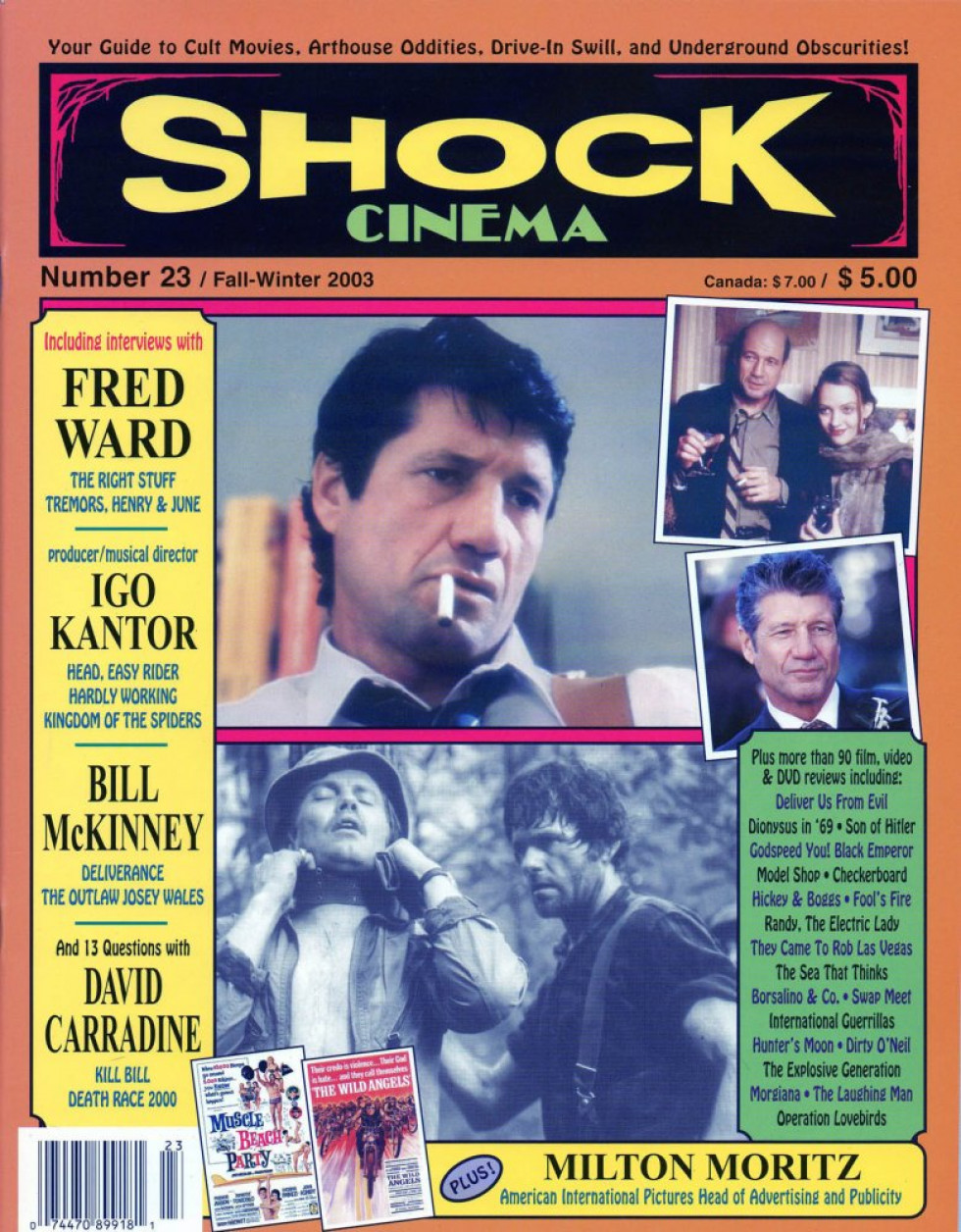 Interviews with actors Fred Ward, Bill McKinney and David Carradine, plus producer/musical director Igo Kantor and American International Pictures Head of Advertising and Publicity Milton Moritz. Reviews include Brian DePalma's Dionysus in '69, Gary Lockwood in They Came to Rob Las Vegas and Jacques Demy's Model Shop, the anti-Salman Rushdie Pakistani action/musical International Guerrillas, Franco Nero in Sergei Bondarchuk's Insurgant Mexico and The Ten Days That Shook the World, the Japanese biker documentary Godspeed You! Black Emperor, Morgan Paull in Dirty O'Neil: The Love Life of a Cop, Horace Jackson's Tough and Deliver Us From Evil, The Laughing Man, Merrill Womach's He Restoreth My Soul, Michael J. Anderson in Julie Taymor's Fool's Fire, Randy, the Electric Lady, Bill Cosby and Robert Culp in Hickey & Boggs, Calvin Lockhart in Contact, a.k.a. The African Deal, Sarah Manners in Sugar Sugar, Gert de Graaff's The Sea That Thinks, The Tramps and the Wizard of Oroz, Juraj Herz's Morgiana, Santa and the Ice Cream Bunny, Barbara Bouchet in Colpo Roverte, a.k.a. The Syndicate, et cetera.