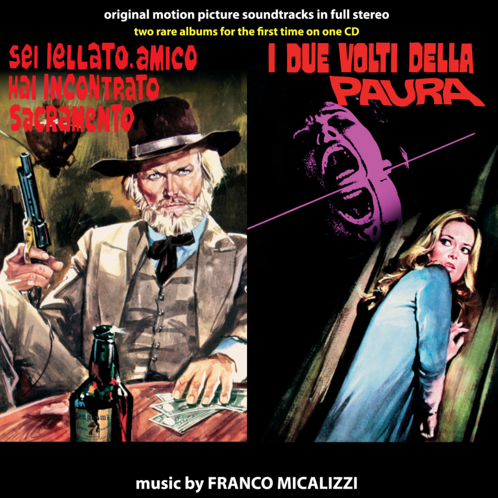 Digitmovies presents for the first time on CD two original scores composed and conducted by Franco Micalizzi: “Sei jellato amico, hai incontrato Sacramento” (aka “You're Jinxed, Friend, You've Met Sacramento”) and “I due volti della paura“ (aka “The two Faces of Terror”). These two OSTs were released on the top rare Pegaso Library Series. This CD was realized using the stereophonic master tape of the original 33 rpm albums that has been preserved in the Rca Archives until today. “Sei jellato amico, hai incontrato Sacramento” (OST issued on LP Pegaso PG 8) is a Western movie from 1972 directed by Giorgio Cristallini and starring American actor Ty Hardin. Following the huge theatrical and musical success of “Lo chiamavano Trinità”, Franco Micalizzi was engaged to write the score for this motion picture. Like in the case of Trinità, Micalizzi blends the traditional symphonic orchestra with Pop sound: The Main Theme is a Spiritual Beat for orchestra and Choir, pure Pop concerning the use of brass and percussions (Tr.1). The theme is reprised with a Burlesque – Beat key in Tr.5 and also in the Finale (Tr.15). This OST features frequent participation of the extraordinary harmonica of Franco De Gemini as well as the incredible voice of Edda Dell’Orso (Tr.2). Distorted electric guitars accompany the trumpet in the melancholic Deguello (Tr.3) evoking the atmosphere of Sergio Leone’s Cinema. The score is enriched with airy romantic themes (Tr.4, Tr.10, Tr.11), suspense and action music (Tr.7,Tr.8,Tr.13), folklore tunes (Tr.6,Tr.12) and with a fabulous Gospel for solo male voice, choir and orchestra (Tr.9). “I due volti della paura” (OST issued on LP Pegaso PG 5) is a 1972 Giallo directed by Tullio Demicheli, starring Gorge Hilton, Luciana Paluzzi, Anita Strindberg and Fernando Rey. During the early ‘70s many Giallo movies were released in the theatres with music scores by Ennio Morricone and Bruno Nicolai. Franco Micalizzi composed an OST with sound typical for that period. After an introduction of a classical flavoured Adagio, the main theme is developed with a Beat arrangement vocalized by Edda Dell’Orso (Tr.16). The main theme is then reprised with a romantic mood for organ, bass guitar and orchestra (Tr.17), with a shake dancefloor version (Tr.20), in a fast “chase” with bongos and female voice (Tr.21) and as a slow adagio with Edda’ s voice (Tr.27). Apart from dissonant suspense themes (Tr.23, Tr.25, Tr.27) Micalizzi provided another classic flavoured theme, but with Beat arrangement vocalized by Edda (Tr.22,Tr.24). The OST concludes with a long track for liturgical organ (Tr.18) and with an aggressive shake (Tr.26).